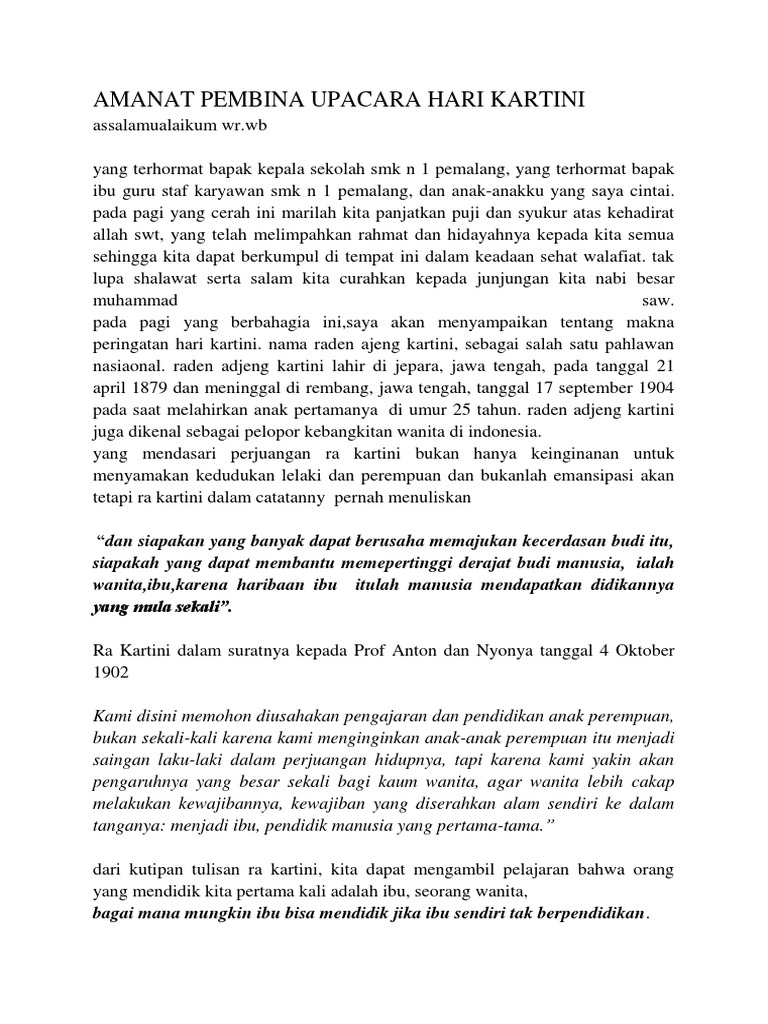 Berikut ini beberapa contoh amanat pembina upacara Hari Kartini 2026: