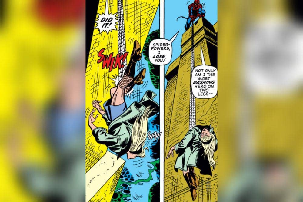 Jika kamu membaca komik ini, mungkin kamu akan menyalahkan Green Goblin atas kematian Gwen Stacy. Pasalnya, dialah yang membawa Gwen Stacy ke puncak jembatan dan melemparkannya untuk menyiksa Spider-Man. Namun, kematian Gwen Stacy sebenarnya terjadi karena kesalahan Spider-Man sendiri. Nah, saat Spider-Man mencoba menyelamatkan Gwen dengan mencengkeram kakinya menggunakan jaring laba-laba saat Gwen mulai terjun ke Sungai Hudson, hal ini justru membuat leher Gwen patah. Ada suara “krek!” yang tertulis di samping leher Gwen. Hal ini menunjukan bahwa leher Gwen mengalami cedera parah yang membuatnya meninggal dunia.