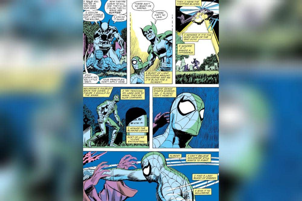 Spider-Man itu tidak membunuh, seperti yang selalu digambarkan dalam banyak ceritanya. Ini juga terlihat dari aksinya yang selalu menahan diri saat melawan penjahat biasa hingga penjahat kejam. Tidak seperti pahlawan lainnya, Spider-Man tidak pernah membunuh siapa pun dalam cerita komiknya selama 50 tahun lamanya. Namun, ada satu momen dimana ia melakukannya. Pembunuhan ini terjadi dalam komik Spider-Man Vs. Wolverine, sebuah cerita pendek tahun 1987 oleh Christopher Priest dan Mark Bright yang menyeret Spidey ke dunia spionase internasional. Teman Wolverine yang bernama Charlie merupakan seorang mata-mata Amerika dengan nama sandi Charlemagne. Dalam cerita ini, Wolverine ingin membunuh Charlie karena Charlie membunuh banyak mata-mata Rusia.