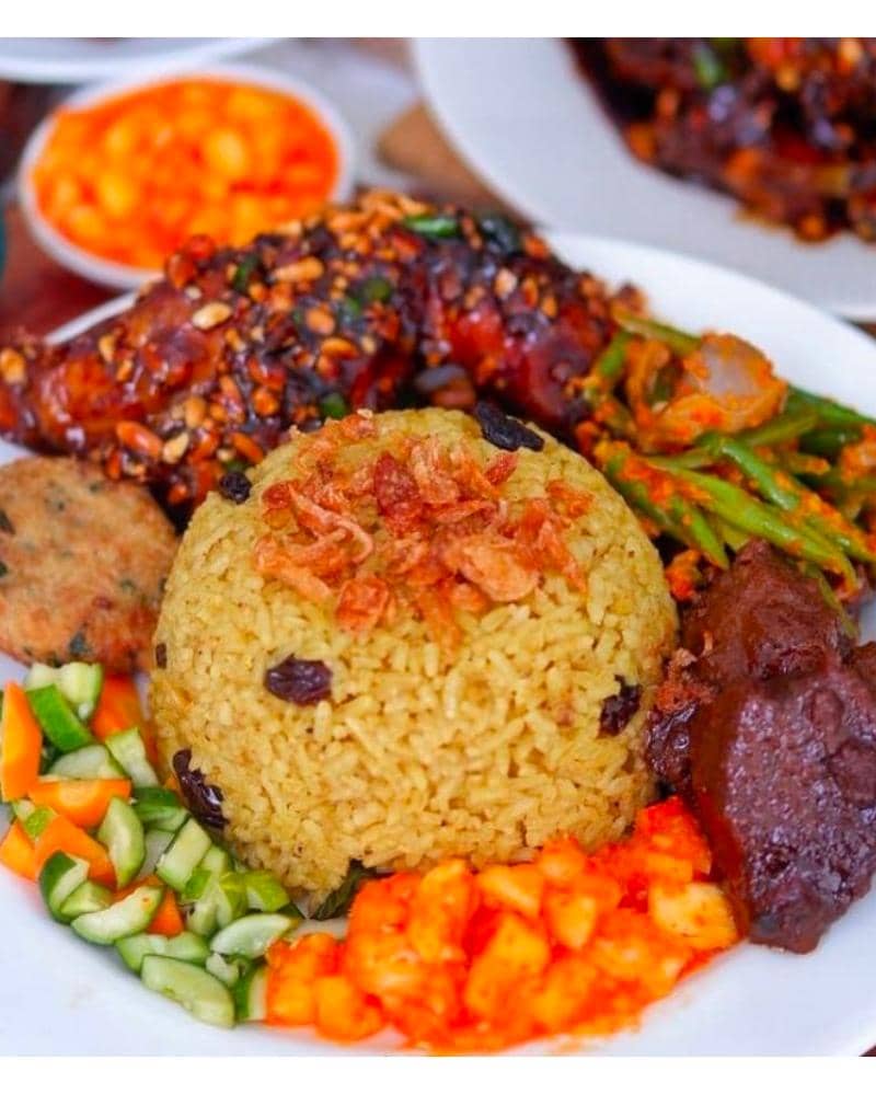 Nasi Minyak bukanlah nasi yang dicampur minyak, tetapi mirip dengan nasi kebuli. Pengaruh budaya Timur Tengah sangat terasa dalam hidangan ini. Nasi Minyak dimasak dengan minyak samin dan rempah-rempah khas Indonesia. Biasanya disajikan dengan sambal nanas, daging malbi, acar ketimun, sate pentol, dan ayam goreng bertabur kismis. Nasi Minyak sering disajikan dalam acara spesial seperti pernikahan, syukuran, dan Idul Fitri. Kamu bisa mencoba nasi minyak autentik di Nasi Minyak Cek Geda, Palembang. Harganya berkisar antara Rp8.000 hingga Rp20.000.