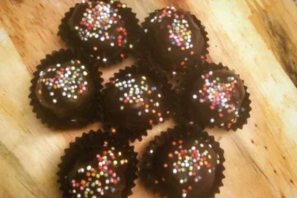 Tumbuk dulu oreo cokelat sampai hancur. Setelah itu, tambahkan 2 sachet susu kental manis cokelat, lalu aduk sampai tercampur rata. Bentuk bulat-bulat kecil adonan sampai habis. Tim dark cooking chocolate sampai meleleh. Celupkan bola-bola oreo ke dalam dark cooking chocolate, lalu letakkan di atas cup kue kecil. Jangan lupa tambahkan sprinkles di atasnya, diamkan sampai cokelatnya set. Simpan dalam wadah kedap udara.
