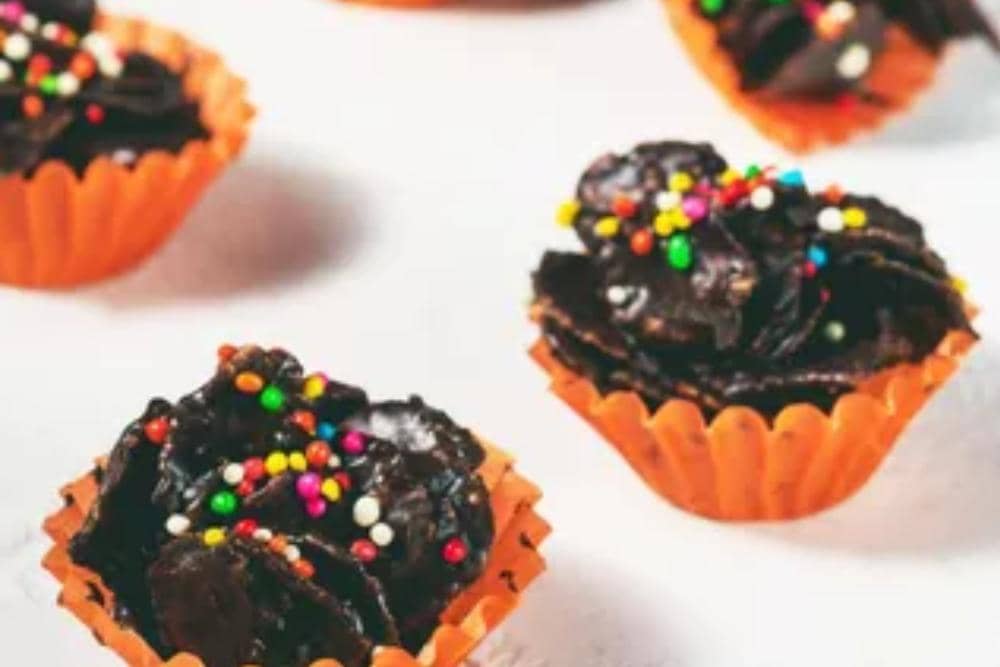 Lelehkan dulu dark cooking chocolate dengan cara ditim supaya meleleh sempurna, lalu angkat. Masukkan cokelat dan cornflakes ke dalam wadah yang agak besar, lalu aduk sampai rata. Ambil 1 sdt cornflakes, lalu letakkan dalam paper cupcake case yang kecil. Tambahkan taburan sprinkles di atasnya dan lakukan sampai habis. Diamkan sampai beberapa menit sampai cokelat mengeras, lalu sajikan.