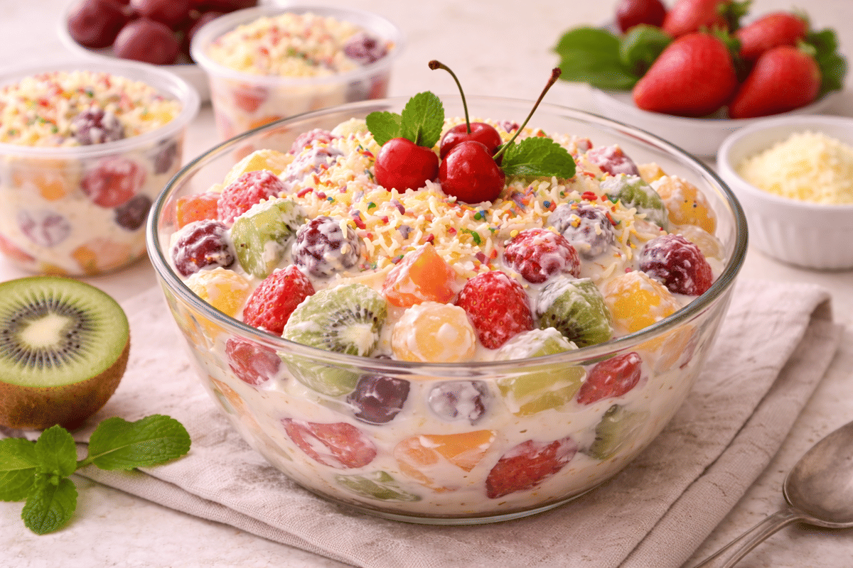Salad buah segar dapat melepas dahaga sekaligus memberikan nutrisi dari berbagai buah. Pastikan buah-buahan dicuci bersih dan gunakan mayones yang telah dipasteurisasi untuk menghindari risiko bakteri seperti Salmonella.