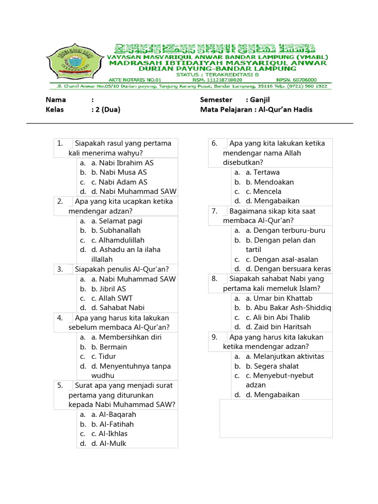 Kumpulan Sohal dan Jawaban Alquran Hadist Kelas 2 SD/MI