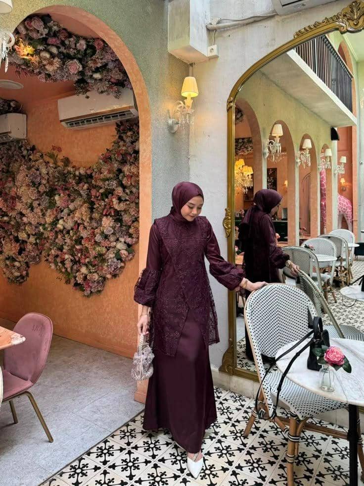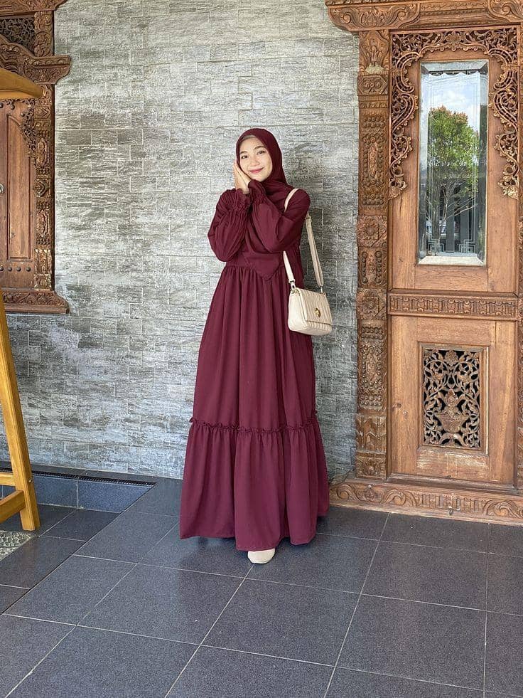 Kebaya modern berwarna burgundy menampilkan gaya feminin yang tetap relevan dengan zaman. Potongan sederhana yang dipadukan dengan kain tradisional memberikan sentuhan modis tanpa meninggalkan warisan budaya. Warna burgundy memberikan nuansa baru pada kebaya untuk Lebaran. Kebaya warna burgundy ini cocok dipadukan dengan bawahan berwarna netral seperti putih, krem, atau abu-abu, menciptakan kesan elegan dan modern.Gamis rimpel yang cantik dan elegan