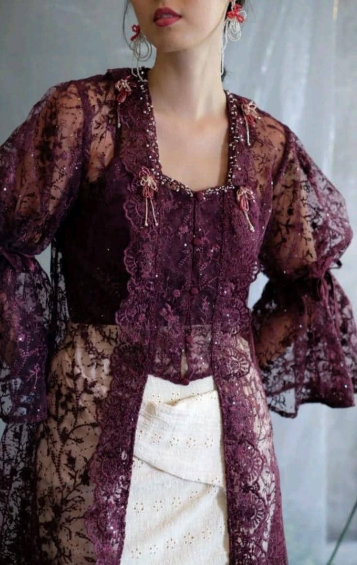 Warna burgundy tidak hanya digemari dalam busana wanita, tetapi juga menjadi tren baju koko pria. Baju koko burgundy biasanya hadir dengan potongan modern dan detail halus seperti bordiran ringan. Warna burgundy memberikan sentuhan elegan, namun tetap menjaga nilai-nilai religius dan tradisional. Selain itu, warna burgundy untuk baju koko pria memberikan kesan maskulin yang mendalam. Jadi, jika kamu mencari referensi baju Lebaran keluarga warna burgundy, baju koko ini bisa menjadi pilihan yang tepat.Kebaya modern warna burgundy dengan potongan minimalis