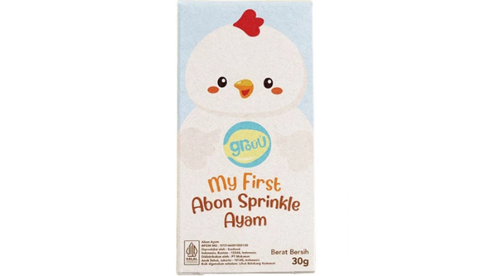 Abon khusus bayi yang dibuat menggunakan ayam kampung berkualitas tinggi, sebagai sumber protein sehat untuk bayi. Produk MPASI ini diperkaya dengan Japanese nori, Australian cheddar cheese, dan wijen untuk rasa yang lebih gurih dan unik. Memiliki tekstur yang crunchy, sehingga memberikan pengalaman makan yang berbeda untuk si kecil. Cocok dijadikan sebagai pelengkap MPASI dan merupakan kombinasi rasa yang disukai anak-anak.Grouu My First Abon Sprinkle Ayam