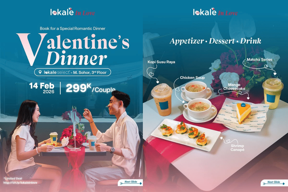Lokale adalah tempat dinner Valentine romantis di Jakarta yang bisa kamu pertimbangkan jika ingin paket yang lebih terjangkau tapi tetap manis. Lokale menawarkan dinner set mulai dari Rp300 ribu per couple dengan menu lengkap dari appetizer sampai dessert. Setiap pembelian paket juga sudah termasuk bouquet, special chocolate, flower latte, dan gift card. Jadi suasana tetap terasa romantis meski budget lebih ramah.