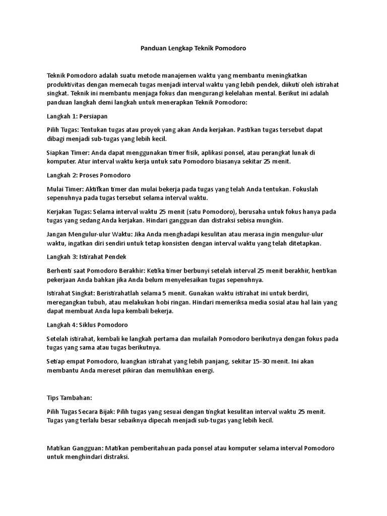 Teknik ini membagi waktu menjadi beberapa bagian yaitu bekerja selama 25 menit tanpa gangguan, istirahat selama 5 menit, lalu setelah 4 siklus bisa istirahat yang lebih panjang (15-30 menit). Menariknya, teknik ini membantu Anda tetap fokus dan menghindari kelelahan mental. Tips satu ini sangat sesuai dan mudah diterapkan saat puasa karena memberi jeda istirahat singkat yang bisa digunakan untuk ibadah ringan seperti dzikir.Istirahat yang cukup