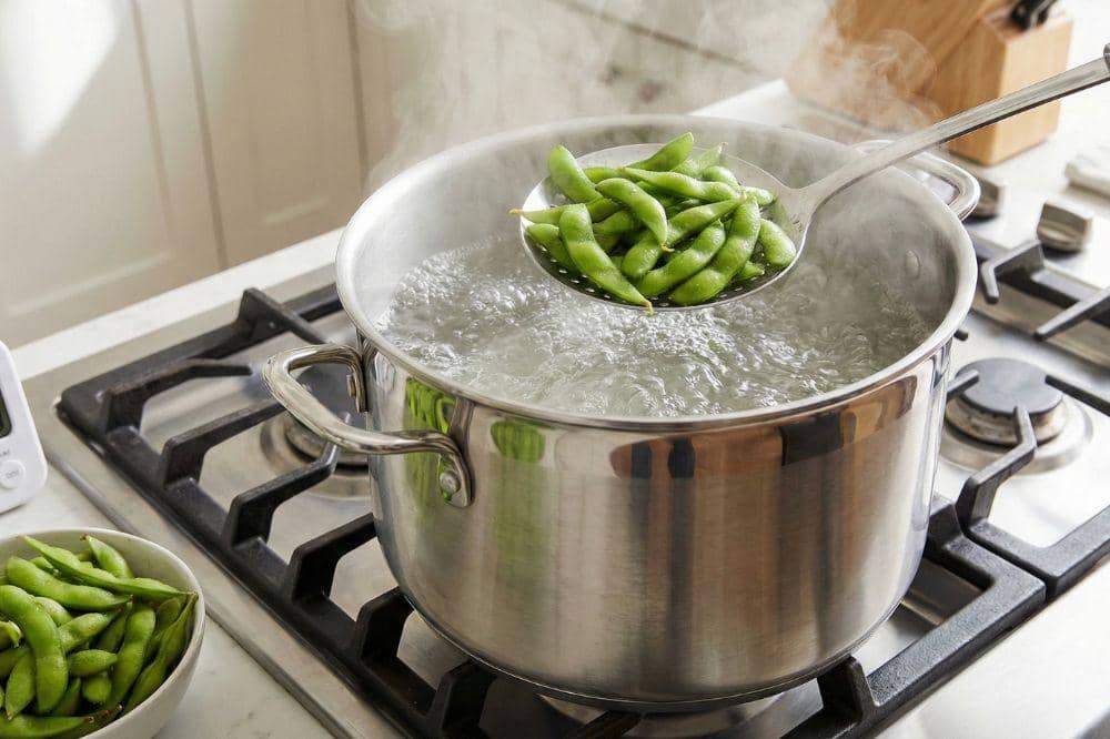 Mama cukup merebus edamame ke dalam panci berisi air mendidih selama dua hingga tiga menit saja. Perebusan singkat ini bertujuan untuk menonaktifkan enzim penyebab kebusukan, sehingga nutrisi dan kualitas rasa edamame tetap terkunci sempurna.Rendam di air es untuk menghentikan pematangan
