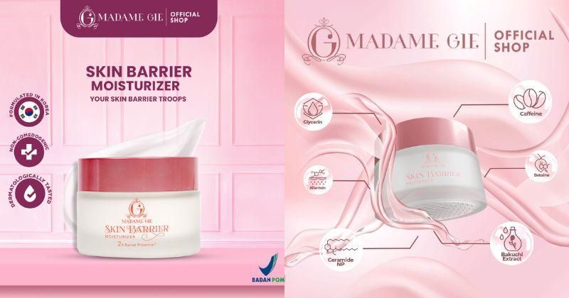 Diformulasikan dengan moisture lock8x hyaluronan, ultra-moisture lock, dan 5x ceramide, pelembap ini memberikan hidrasi mendalam. Kandungan magnolia sieboldii extract membantu mencerahkan dan meratakan warna kulit. Selain itu, ada kandungan mugwort extract dan 5x calming agents yang berperan dalam menenangkan kulit. Harga sekitar Rp 129.000 dalam ukuran 30 gr.Madame Gie Skin Barrier Moisturizer