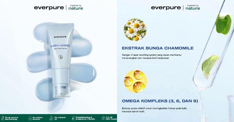 Diformulasikan dengan centella asiatica, aloe vera, niacinamide, dan ekstrak delima, pelembap ini tidak hanya melembapkan dan mencerahkan kulit, tetapi juga membantu menenangkan inflamasi, mengurangi kemerahan, serta memudarkan bekas jerawat (PIE). Pelembap ini aman digunakan mulai usia 12 tahun, termasuk untuk ibu hamil dan menyusui. Harga sekitar Rp 150.000 dalam ukuran 30 gr.Everpure Calm-omild Barrier Moisturizer Gel