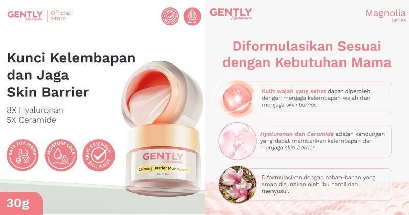 Dengan ekstrak bunga chamomile dan 4-layer soothing system, pelembap ini efektif menenangkan kulit berjerawat dan kemerahan. Terdapat juga kandungan omega complex (3, 6, dan 9) yang meningkatkan hidrasi dan merawat skin barrier. Pelembap ini telah teruji secara klinis mampu melembapkan hingga 72 jam. Harga sekitar Rp 170.000 dalam ukuran 30 gr.Gently Mamacare Calming Barrier Moisturizer
