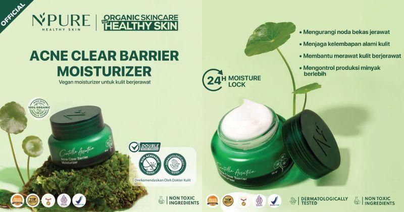 Dengan kandungan ceramide NP, glycerin, allantoin, dan betaine, pelembap ini menjaga skin barrier, menenangkan kulit, serta meningkatkan hidrasi. Bakuchi extract dan caffeine di dalamnya dapat meningkatkan produksi kolagen, mengencangkan kulit, dan mencegah tanda-tanda penuaan dini. Harga sekitar Rp 45.000 dalam ukuran 50 gr.NPure Centella Asiatica Acne Clear Barrier Moisturizer
