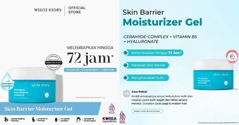 Dengan VC-IP (vitamin C dari Jepang), pelembap ini mencerahkan dan meratakan warna kulit 3x lebih cepat. Ada kandungan HYALU-10 yang menghidrasi kulit hingga 10 lapisan terdalam. Selain itu, terdapat 6X ceramide dan Natural Moisturizing Factor (NMF) untuk memperbaiki dan memperkuat skin barrier. Harga sekitar Rp 220.800 dalam ukuran 30 gr.White Story Skin Barrier Moisturizer Gel