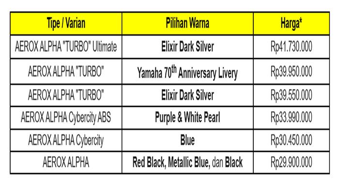 Selain itu, Yamaha juga meluncurkan varian baru pada AEROX ALPHA Cybercity, yaitu AEROX ALPHA Cybercity ABS dengan pilihan warna Purple dan White Pearl. Sementara itu, varian Blue tetap tersedia seperti sebelumnya. Desain grafis pada line-up Cybercity kini diperkaya dengan tulisan AEROX besar pada bagian boomerang dan garis tipis yang menyelimuti body, mencerminkan karakter speed yang khas.