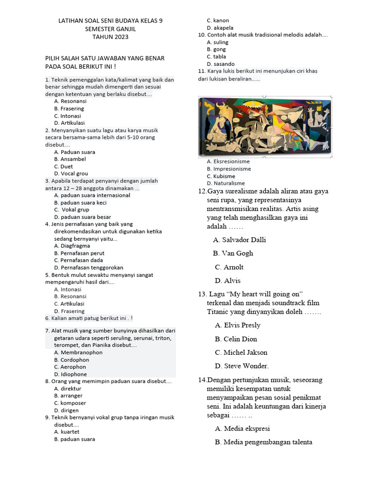 Soal Latihan Seni Budaya Kelas 9 Semester 2 Kurikulum Merdeka Menguasai materi seni budaya kelas 9 semester 2 memerlukan pemahaman mendalam tentang berbagai aspek, termasuk apresiasi dan kreasi seni. Artikel ini menyajikan kumpulan soal seni budaya yang dirancang untuk membantu siswa mempersiapkan ujian dan latihan mandiri. Soal-soal ini disusun berdasarkan Bab 9 hingga Bab 16 dari buku paket resmi. Setiap butir soal dirancang untuk mengasah kemampuan siswa dalam mengenali teknik grafis, manajemen pameran, serta konsep pementasan teater modern. Dengan mempelajari contoh soal secara rutin, siswa diharapkan mampu meraih nilai akademik yang maksimal di sekolah. Penting bagi siswa untuk tidak hanya…