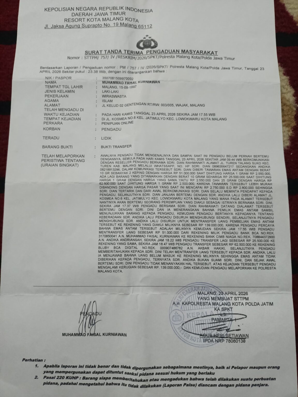 Kota Malang – Penipuan bermodus segitiga kembali memakan korban di wilayah Lowokwaru, Kota Malang, dengan kerugian materiil mencapai ratusan juta rupiah. Peristiwa kriminal ini bermula pada Kamis pagi (23/4/2026), ketika Rahma, warga Talangsuko, Turen, Kabupaten Malang, yang berprofesi sebagai reseller dihubungi oleh seorang laki-laki bernama Andika Ardiansyah melalui aplikasi pesan singkat WhatsApp. Mengaku berdomisili di Jombang, pria tersebut menawarkan dua keping emas batangan Antam seberat 10 gram. Rahma kemudian meneruskan penawaran itu kepada rekan bisnisnya, Faisal Kurniawan warga Gentengan, Wajak, Kabupaten Malang. Setelah Faisal menyepakati harga beli sebesar Rp2.550.000 per gram, Rahma menyampaikan nominal tersebut kepada Andika yang langsung menyetujui…