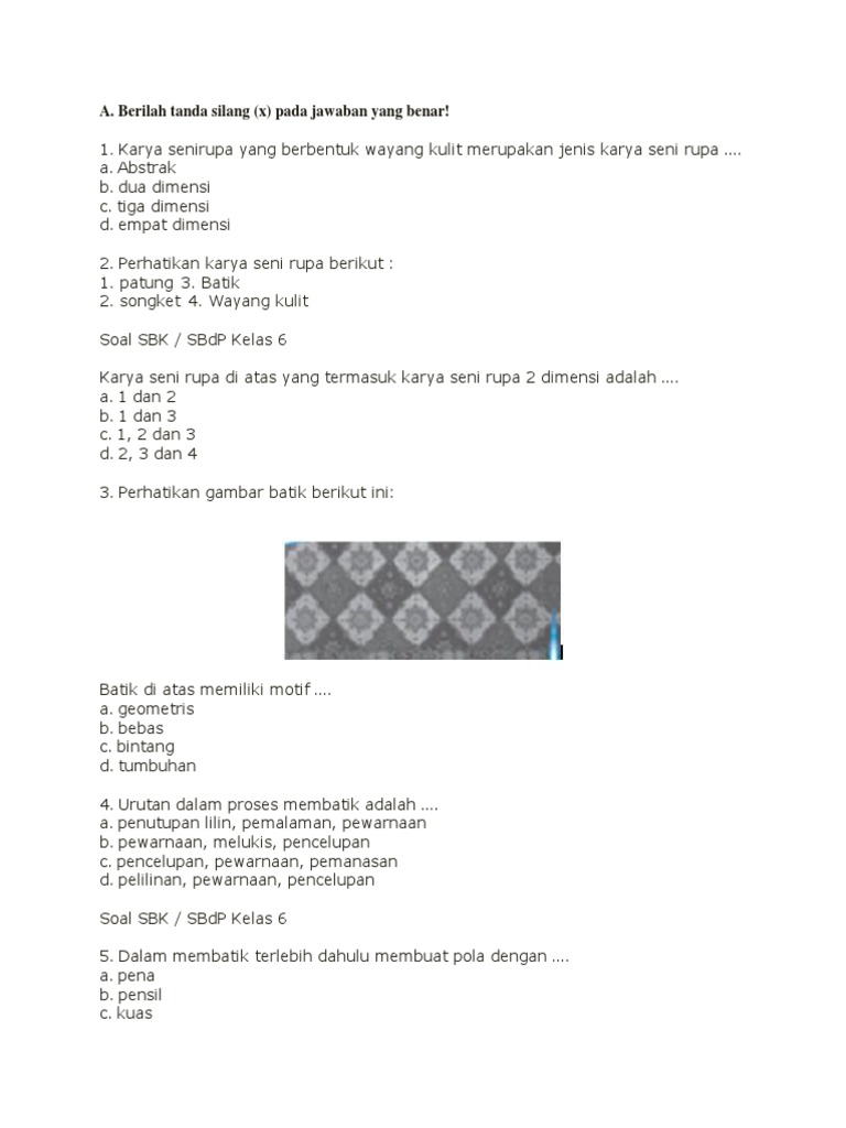 Soal-soal ini dirancang agar siswa mampu memahami berbagai aspek seni dan budaya, seperti motif dekoratif, fungsi gambar ilustrasi, teknik pembuatan kerajinan, serta pengertian tentang tari dan musik daerah. Berikut beberapa contoh soal latihan: