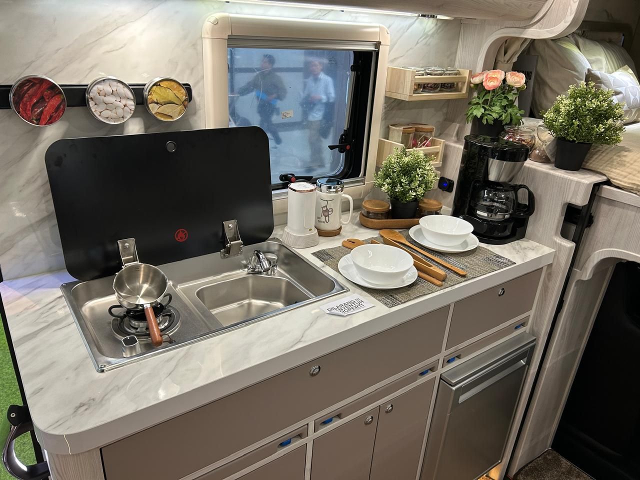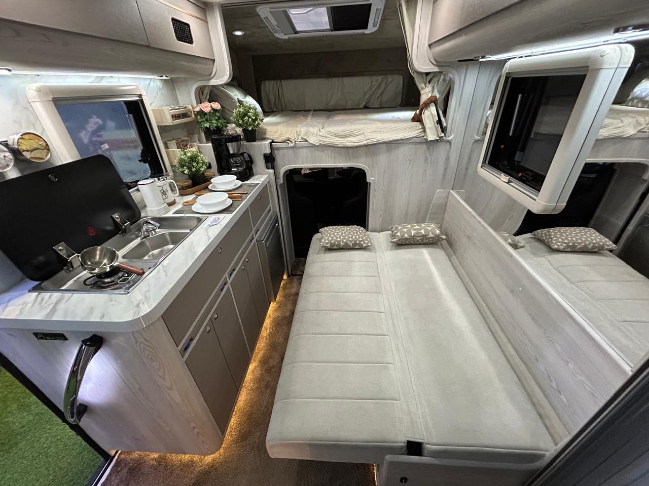 Soal kenyamanan, camper van ini dilengkapi berbagai fasilitas. Di dalamnya terdapat tempat tidur, dapur mini dengan kompor dan sink, kulkas, meja, serta banyak ruang penyimpanan.