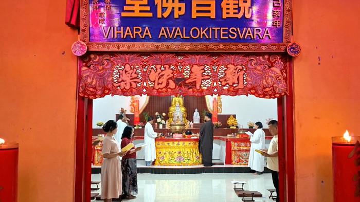Lampu merah khas Tionghoa menghiasi area Vihara Avalokitesvara, Jalan Tjilik Riwut Km 9,5, Palangka Raya, Senin (16/2/2026) malam. Umat silih berganti terus berdatangan, suasana khidmat begitu terasa di vihara. Vihara itu menjadi tempat Umat Buddha dengan latar belakang berbeda berkumpul untuk melaksanakan doa sekaligus merayakan Imlek bersama.