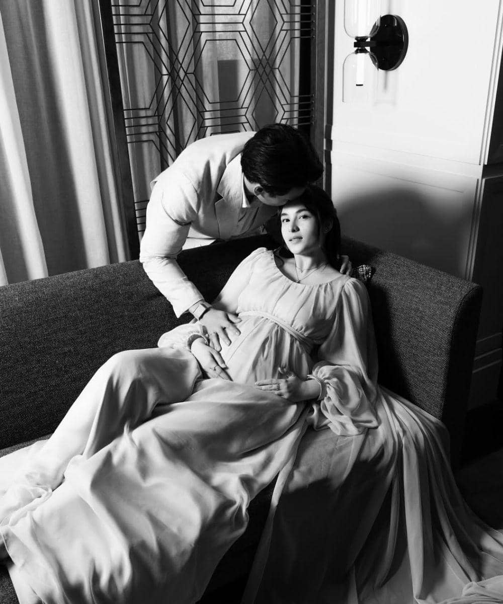 Dalam foto lain, Chelsea membagikan maternity shoot bertema hitam putih. Ia tampak bersandar santai di sofa, sementara Rob mencium keningnya. Suasana foto terasa tenang dan sangat personal.