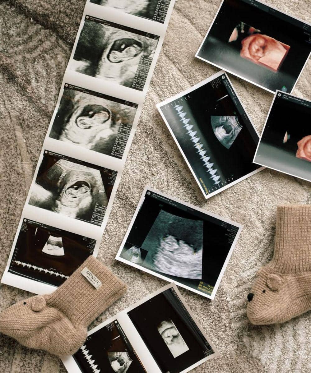 Chelsea juga memperlihatkan kumpulan foto hasil USG yang disusun rapi di atas permukaan karpet. Potret ini menunjukkan perjalanan kehamilan dari waktu ke waktu. Beberapa hasil USG dicetak dan ditata berdampingan, memperlihatkan perkembangan janin yang semakin jelas. Detail kecil seperti kaus kaki bayi ikut melengkapi suasana hangat foto tersebut. Momen ini memperlihatkan bagaimana Chelsea dan Rob menghargai setiap tahap kehamilan sebagai kenangan.