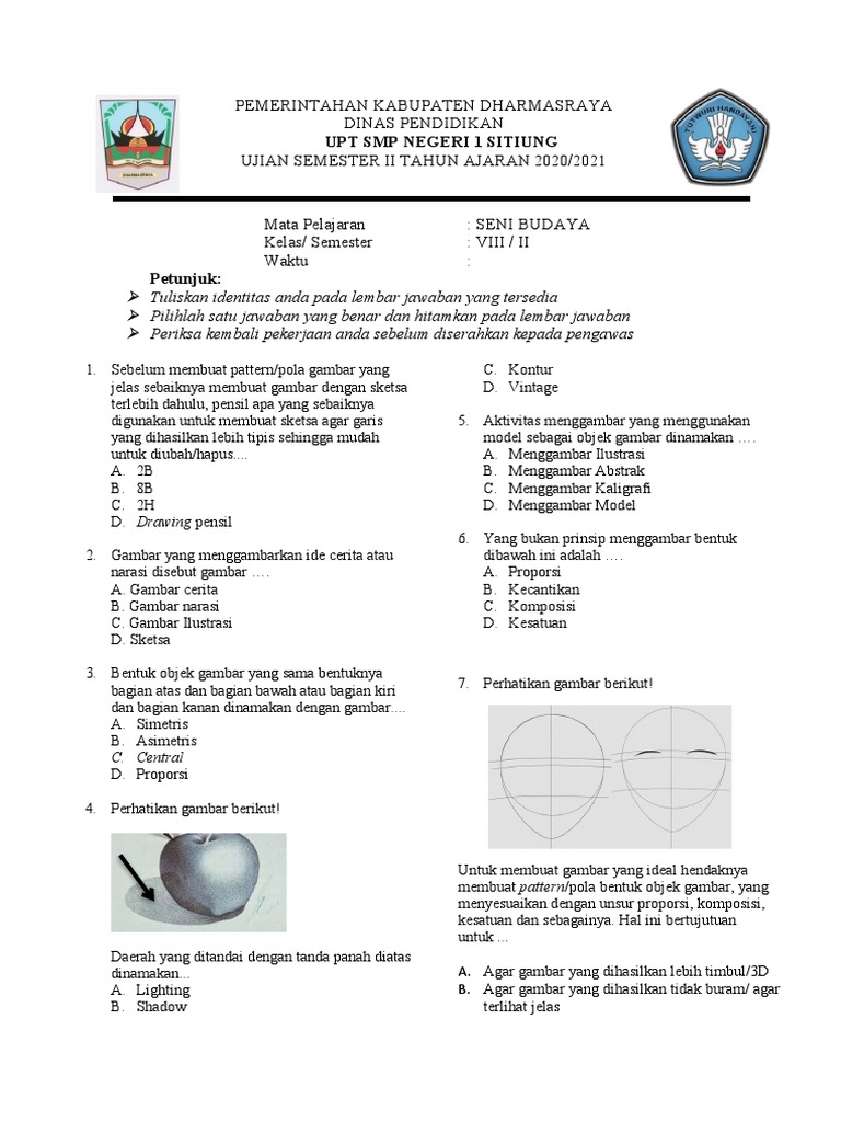 Berikut adalah beberapa contoh soal PAT/SAT Seni Budaya Kelas 5 SD Semester 2:
