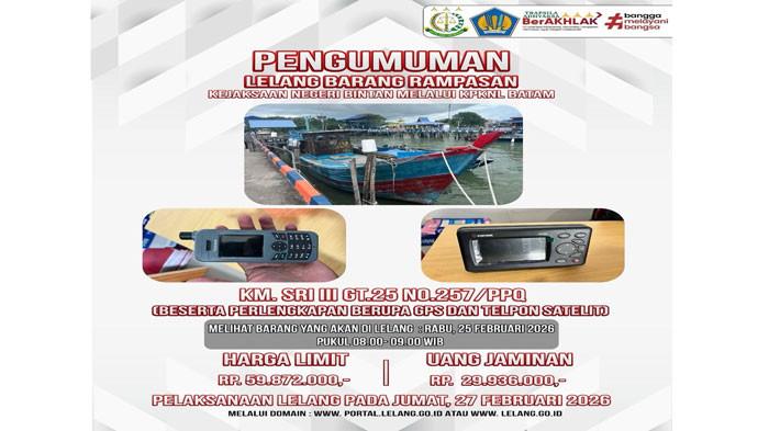 Dari dua objek barang rampasan negara yang dilelang Kejaksaan Negeri (Kejari) Bintan lewat Kantor Pelayanan Kekayaan Negara dan Lelang (KPKNL) Batam, Jumat(27/2/2026), hanya satu objek barang yang laku terjual. Barang itu yakni sebuah kapal KM Sri 25 GT (beserta perlengkapan GPS dan telepon satelit). Kapal ini sebelumnya dilelang dengan nilai limit Rp59.872.000, dan laku terjual dengan harga lebih tinggi. Sementara untuk satu unit sepeda motor Honda Scoopy tahun 2024 (beserta STNK), hasilnya Tidak Ada Penawaran (TAP).