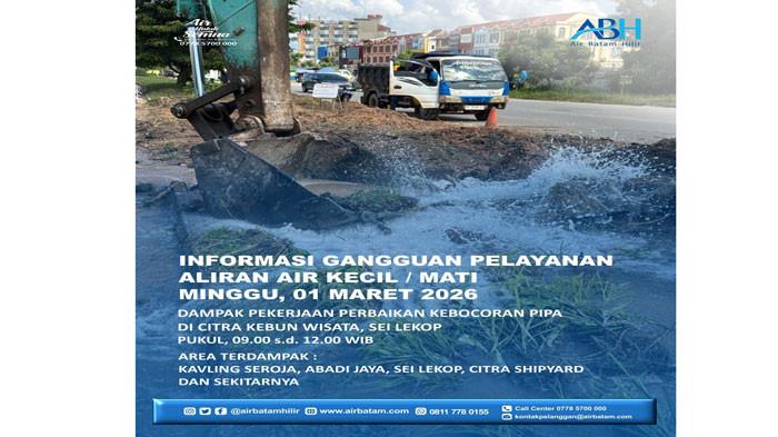 Warga Batam khususnya yang tinggal di Kecamatan Sagulung, bersiaplah dengan kemungkinan mati air besok, Minggu 1 Maret 2026. Air Batam Hilir menginformasikan ada gangguan air, dampak pekerjaan perbaikan kebocoran pipa HDPE DN 110mm di depan Citra Kebun Wisata, Sei Lekop. Jadwal mati air di Batam besok ini rencananya dari pukul 09.00-12.00 WIB. Selama pekerjaan ini, akan berdampak pada gangguan pelayanan suplai air minum berupa air kecil dan air terhenti untuk sementara waktu.
