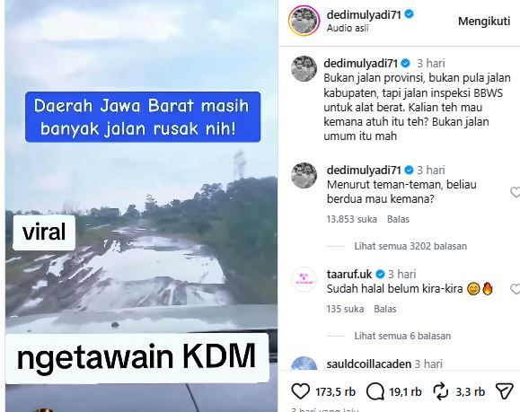 Dengan penjelasan ini, Dedi Mulyadi skakmat sang netizen dengan mempertanyakan alasan keberadaan pembuat video tersebut. Ia menulis, “Bukan jalan provinsi, bukan pula jalan kabupaten, tapi jalan inspeksi BBWS untuk alat berat. Kalian teh mau kemana atuh itu teh? Bukan jalan umum itu mah.”