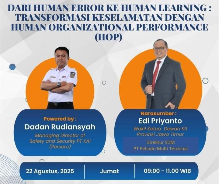 Surabaya (IMR) – Dewan Keselamatan dan Kesehatan Kerja (K3) Provinsi Jawa Timur menegaskan pentingnya mengubah cara pandang terhadap kesalahan. Alih-alih menyalahkan, kesalahan manusia seharusnya menjadi peluang untuk belajar. Pesan ini disampaikan dalam Webinar Safety Series PT Kereta Api Indonesia (Persero) bertema “Dari Human Error ke Human Learning: Transformasi Keselamatan dengan HOP” pada Jumat (22/8/2025).