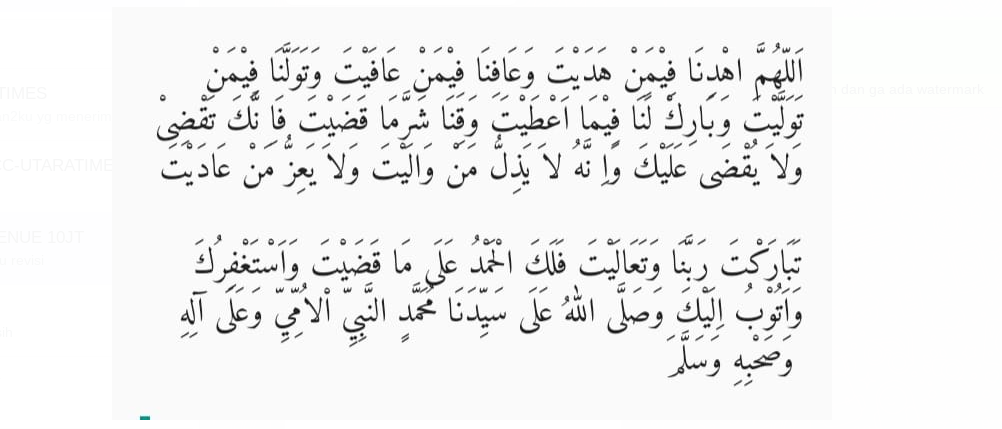اللَّهُمَّ اهْدِنِي فِيْمَنْ هَدَيْتَ، وَعَافِنِي فِيْمَنْ عَافَيْتَ، وَتَوَلَّنِي فِيْمَنُ تَوَلَّيْتَ، وَبَارِكْ لِي فِيْمَا أَعْطَيْتَ، وَقِنِي بِرَحْمَتِكَ شَرَّمَا قَضَيْتَ، فَإِنَّكَ تَقْضِي وَلَا يُقْضَى عَلَيْكَ، وَإِنَّهُ لَا يَذِلُّ مَنْ وَالَيْتَ، وَلَا يَعِزُّ مَنْ عَادَيْتَ، تَبَارَكْتَ رَبَّنَا وَتَعَالَيْتَ، فَلَكَ الْحَمْدُ عَلَى مَا قَضَيْتَ، أَسْتَغْفِرُكَ وَأَتُوْبُ إِلَيْكَ، وَصَلَّى اللَّهُ عَلَى سَيِّدِنَا مُحَمَّدٍ النَّبِيِّ الْأُمّي وَعَلَى آلِهِ وَصَحْبِهِ وَسَلَّم - Latin: