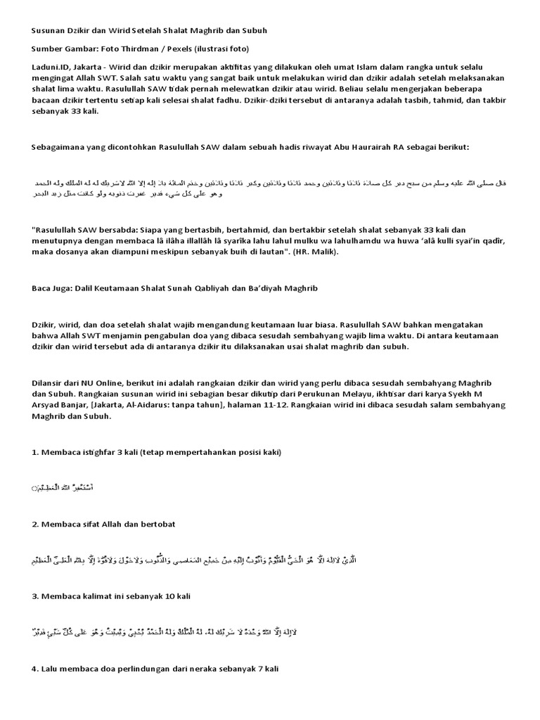 Berikut adalah daftar bacaan wirid dan dzikir yang dapat dilakukan setelah sholat Maghrib: