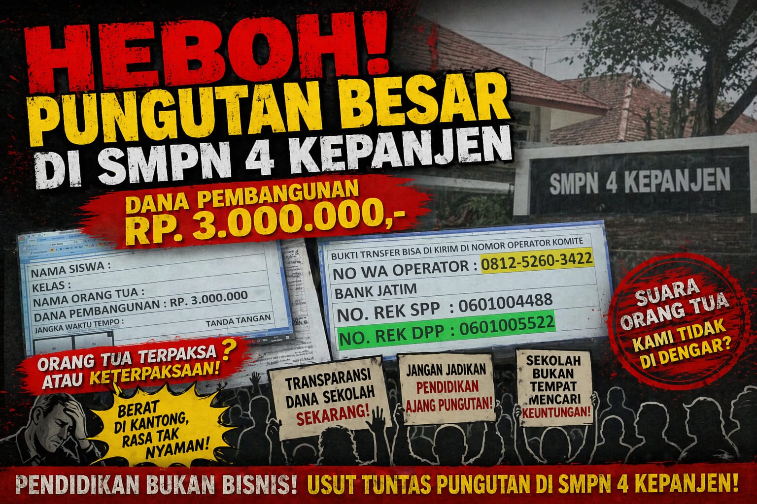 Kabupaten Malang – Dugaan penarikan dana hingga Rp3.000.000 kepada orang tua siswa di SMPN 4 Kepanjen, Kabupaten Malang, memicu tanda tanya publik. Praktik tersebut dinilai bertolak belakang dengan kebijakan pemerintah terkait pendidikan dasar yang seharusnya dapat diakses tanpa biaya.