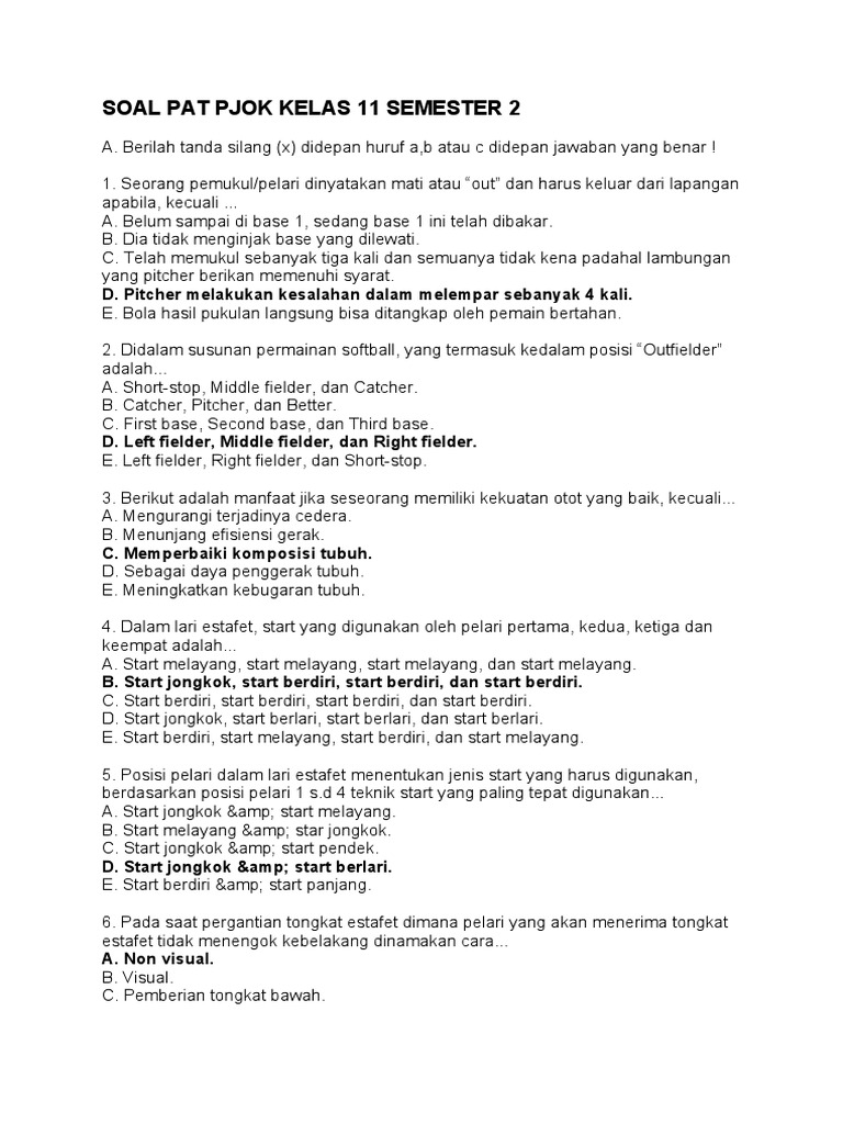 Berikut ini adalah contoh soal Penilaian Akhir Tahun (PAT) atau Sumatif Akhir Tahun (SAT) mata pelajaran Pendidikan Jasmani Olahraga dan Kesehatan (PJOK) untuk siswa kelas 5 SD/MI semester 2 tahun pelajaran 2025/2026. Setiap soal dilengkapi dengan kunci jawaban, sehingga dapat digunakan siswa sebagai bahan latihan mandiri maupun referensi guru dalam evaluasi pembelajaran.