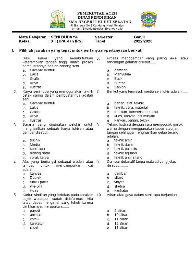 Salah satu cara yang bisa dilakukan siswa untuk memahami materi yang diajarkan di sekolah adalah dengan banyak berlatih mengisi latihan soal untuk menguji sejauh mana suatu materi telah dikuasai. Untuk mempersiapkan diri lebih matang lagi menghadapi Penilaian Akhir Tahun (PAT) atau Sumatif Akhir Tahun (SAT), berikut contoh soal PAT atau SAT materi Seni Budaya Kelas 4 SD Semester 2 (Genap) tahun 2025/2026: