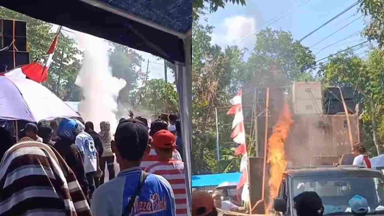 Sebuah genset yang ditaruh di samping tumpukan sound terbakar. Beberapa akun media sosial menginformasikan bahwa itu adalah parade sound horeg. Benarkah?