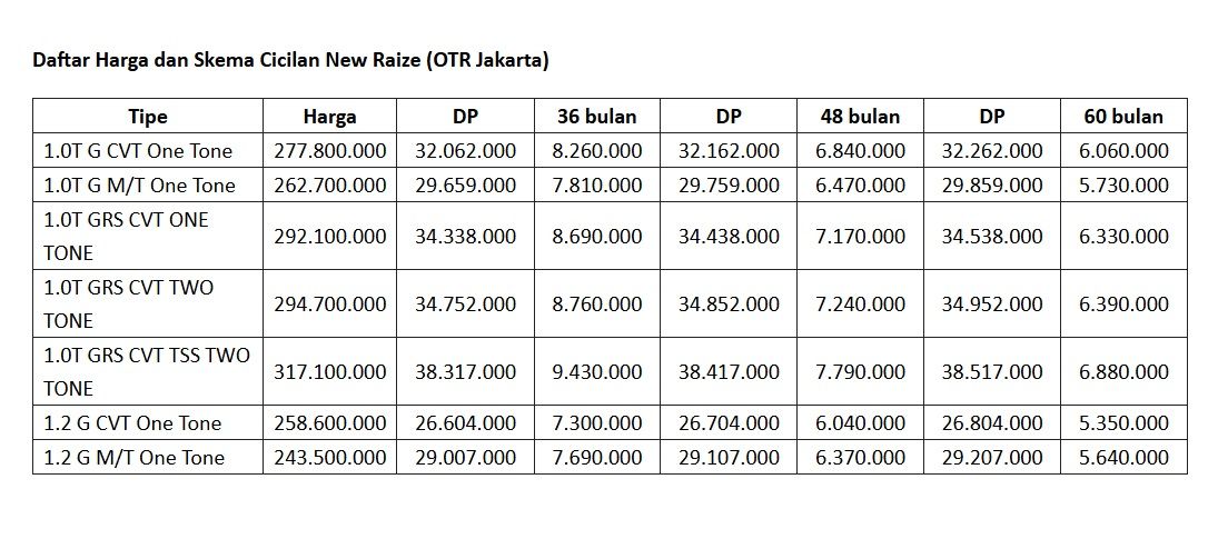 Data lengkap mengenai skema cicilan Toyota New Raize dari Auto2000 dapat dilihat di bawah ini: