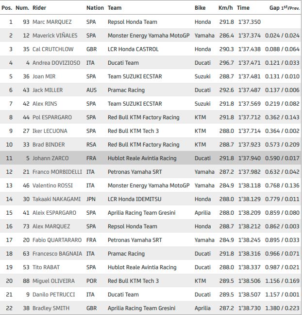 Di akhir sesi, Fabio Di Giannantonio merangsek ke posisi pertama dengan catatan waktu 1:36,954 detik. Rekan setimnya, Franco Morbidelli, juga mengikuti dengan waktu yang sama menggunakan kompon ban yang sama.