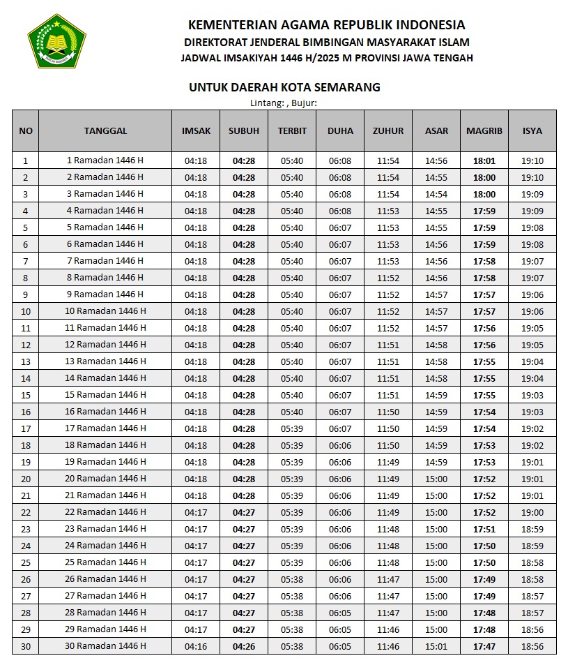 Berdasarkan data dari Bimas Islam Kementerian Agama RI, jadwal imsakiyah Ramadan 2026 untuk wilayah Kabupaten Banyuwangi telah tersedia secara lengkap. Waktu imsak, subuh, terbit, dhuha, dzuhur, ashar, maghrib, dan isya disusun sesuai perhitungan astronomis, sehingga masyarakat dapat menjalankan ibadah puasa dengan tepat waktu.