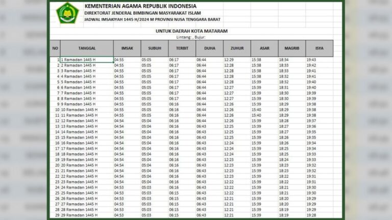 Jadwal imsakiyah yang tersedia lengkap ini mencakup waktu imsak, subuh, terbit matahari, dhuha, dzuhur, ashar, maghrib, dan isya. Semua waktu tersebut disusun berdasarkan perhitungan astronomis agar masyarakat dapat menjalankan ibadah puasa dengan tepat waktu. Dengan adanya jadwal imsakiyah resmi ini, umat Muslim di Kota Mataram dapat memastikan kegiatan sahur dan berbuka sesuai waktu yang telah ditentukan, sehingga menjaga kekhusyukan ibadah serta menyambut bulan penuh berkah dengan persiapan yang lebih teratur.