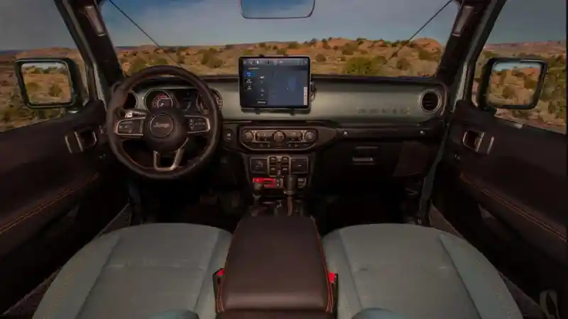Tampilan interior dari Jeep Wrangler Anvil 715 Concept juga sangat unik. Jok depan dan belakang dilapisi kain khusus dengan warna hijau yang mirip dengan cat eksterior. Warna ini juga muncul di bagian dasbor. Di area dasbor, terdapat layar baru yang terpasang dan diarahkan ke pengemudi, menjalankan sistem pemetaan Trails Offroad.
