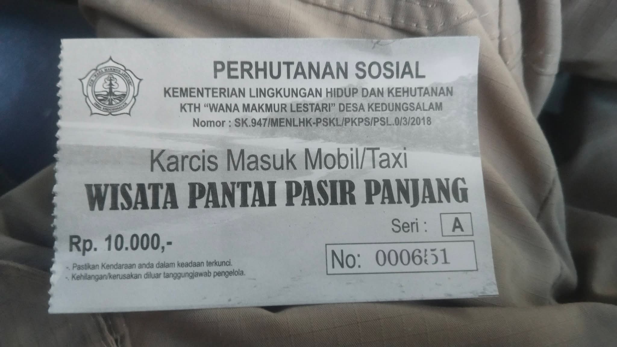 Karcis senilai Rp10.000 tersebut mencantumkan nama pengelola Kelompok Tani Hutan (KTH) “Wana Makmur Lestari” Desa Kedungsalam, yang berada dalam skema Perhutanan Sosial di bawah Kementerian Lingkungan Hidup dan Kehutanan.