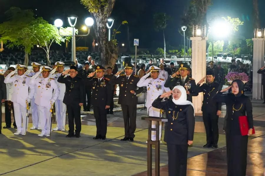 Surabaya (IMR) – Gubernur Jawa Timur, Khofifah Indar Parawansa, memimpin Apel Kehormatan dan Renungan Suci (AKRS) di Taman Makam Pahlawan (TMP) 10 Nopember, Surabaya, Minggu (17/8/2025) dini hari.