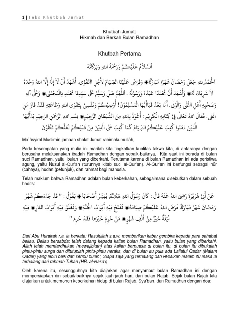 اَلْحَمْدُ لِلهِ حَمْدًا كَمَا أَمَرَ. أَشْهَدُ أَنْ لَااِلَهَ اِلَّا الله وَحْدَهُ لَا شَرِيْكَ لَهُ، اِلَهٌ لَمْ يَزَلْ عَلَى كُلِّ شَيْءٍ وَكِيْلًا. وَأَشْهَدُ أَنَّ مُحَمَّدًا عَبْدُهُ وَرَسُوْلُهُ وَحَبِيْبُهُ وَخَلِيْلُهُ، أَكْرَمِ الْأَوَّلِيْنَ وَالْأَخِرِيْنَ، اَلْمَبْعُوْثِ رَحْمَةً لِلْعَالَمِيْنَ. اللهم صَلِّ وَسَلِّمْ عَلَى سَيِّدِنَا مُحَمَّدٍ وَعَلىَ أَلِهِ وَأَصْحَابِهِ وَمَنْ كَانَ لَهُمْ مِنَ التَّابِعِيْنَ، صَلَاةً دَائِمَةً بِدَوَامِ السَّمَوَاتِ وَالْأَرْضِيْنَأَمَّا بَعْدُ: فَيَا أَيُّهَا الْحَاضِرُوْنَ اتَّقُوا اللَّهَ حَقَّ تُقَاتِهِ وَذَرُوْا الْفَوَاحِشَ مَا ظَهَرَ مِنْهَا وَمَا بَطَنَ. وَحَافِظُوْا عَلَى الطَّاعَةِ وَحُضُوْرِ الْجُمْعَةِ وَالْجَمَاعَةِ وَالصَّوْمِ وَجَمِيْعِ الْمَأْمُوْرَاتِ وَالْوَاجِبَاتِ. وَاعْلَمُوْا أَنَّ اللهَ أَمَرَكُمْ بِأَمْرٍ بَدَأَ بِنَفْسِهِ. وَثَنَى بِمَلَائِكَةِ الْمُسَبِّحَةِ بِقُدْسِهِ. إِِنَّ اللَّهَ وَمَلائِكَتَهُ يُصَلُّونَ عَلَى النَّبِيِّ يَا أَيُّهَا الَّذِينَ آمَنُوا صَلُّوا عَلَيْهِ وَسَلِّمُوا تَسْلِيماًاللهم صَلِّ عَلَى سَيِّدِنَا مُحَمَّدٍ وَعَلَى أَلِ سَيِّدِنَا مُحَمَّدٍ كَمَا صَلَّيْتَ عَلَى سَيِّدِنَا اِبْرَاهِيْمَ وَعَلَى أَلِ سَيِّدِنَا اِبْرَاهِيْمَ وَبَارِكْ عَلَى اِبْرَاهِيْمَ وَعَلَى أَلِ سَيِّدِنَا مُحَمَّدٍ كَمَا بَارَكْتَ عَلَى سَيِّدِنَا اِبْرَاهِيْمَ وَعَلَى أَلِ سَيِّدِنَا اِبْرَاهِيْمَ فِيْ العَالَمِيْنَ اِنَّكَ حَمِيْدٌ مَجِيْدٌ. اللهم اغْفِرْ لِلْمُسْلِمِيْنَ وَالْمُسْلِمَاتِ وَالْمُؤْمِنِيْنَ وَالْمُؤْمِنَاتِ اَلْأَحْيَاءِ مِنْهُمْ وِالْأَمْوَاتِ. اللهم ادْفَعْ عَنَّا الْبَلَاءَ وَالْغَلَاءَ وَالْوَبَاءَ وَالْفَحْشَاءَ وَالْمُنْكَرَ وَالْبَغْيَ وَالسُّيُوْفَ الْمُخْتَلِفَةَ وَالشَّدَائِدَ وَالْمِحَنَ، مَا ظَهَرَ مِنْهَا وَمَا بَطَنَ، مِنْ بَلَدِنَا هَذَا خَاصَةً وَمِنْ بُلْدَانِ الْمُسْلِمِيْنَ عَامَةً، اِنَّكَ عَلَى كُلِّ شَيْءٍ قَدِيْرٌعِبَادَ اللهِ، اِنَّ اللهَ يَأْمُرُكُمْ بِالْعَدْلِ وَالْاِحْسَانِ وَاِيْتَاءِ ذِيْ الْقُرْبَى وَيَنْهَى عَنِ الْفَحْشَاءِ وَالْمُنْكَرِ وَالْبَغْيِ، يَعِظُكُمْ لَعَلَّكُمْ تَذَكَّرُوْنَ. فَاذْكُرُوْا اللهَ الْعَظِيْمَ يَذْكُرُكُمْ وَلَذِكْرُ اللهِ أَكْبَرُ