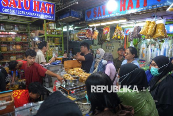 Warga berburu kue kering di Toko Kue Satu Hati, Pasar Jatinegara, Jakarta, Sabtu (7/3/2026). Toko penjualan kue kering yang berada di lantai dasar tersebut mulai diserbu warga untuk membeli sajian saat merayakan Lebaran. – (Infomalangraya.com/Prayogi)