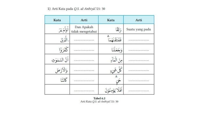 Berikut adalah daftar kata-kata dalam surat al-Anbiya ayat 30 beserta artinya: