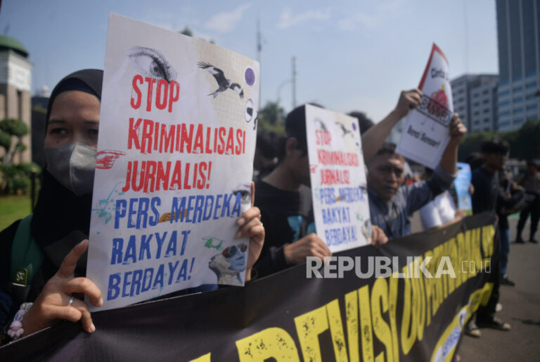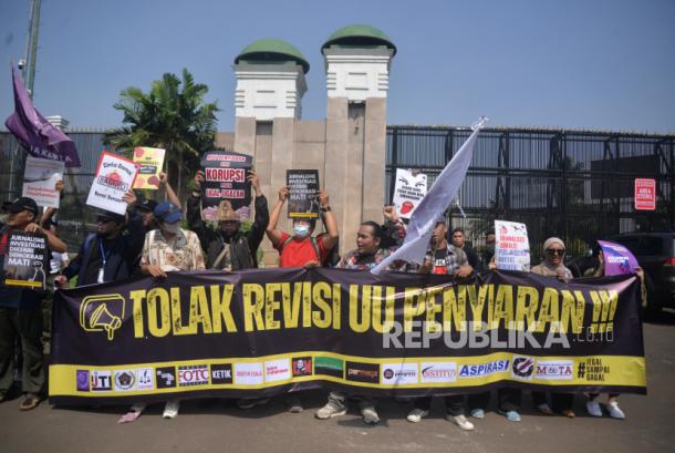 Sejumlah orang yang terdiri dari organisasi profesi wartawan, pekerja kreatif dan pers mahasiswa melakukan aksi damai menolak revisi Undang-Undang Penyiaran di depan kompleks Parlemen, Senayan, Jakarta, Senin (27/5/2024). Dalam aksinya mereka menolak pasal-pasal bermasalah dalam revisi Undang-Undang Penyiaran yang sedang dibahas di DPR RI. Pasal-pasal tersebut akan membungkam kebebasan pers dan kebebasan berekspresi di Indonesia, yang merupakan pilar utama dalam sistem demokrasi.