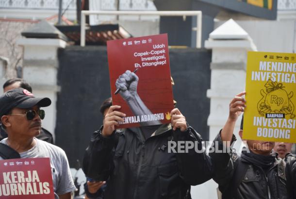 Puluhan wartawan dari berbagai organisasi menggelar aksi menolak revisi UU Penyiaran Nomor 32 Tahun 2002, di depan Gedung DPRD Jawa Barat, Jalan Diponegoro, Kota Bandung, Selasa (28/5/2024). RUU tersebut dinilai memberangus kebebasan pers, membatasi ruang gerak media dan mengurangi keberagaman dalam penyampaian informasi kepada publik.